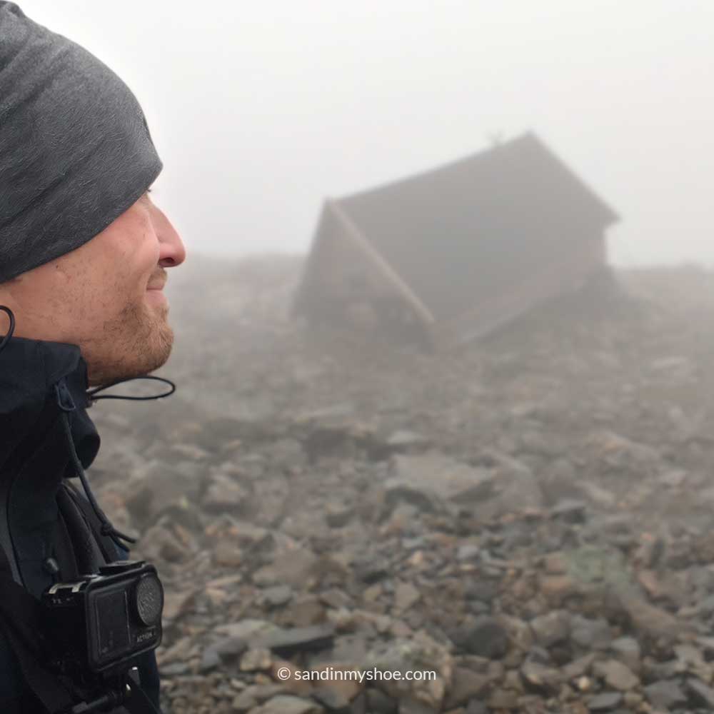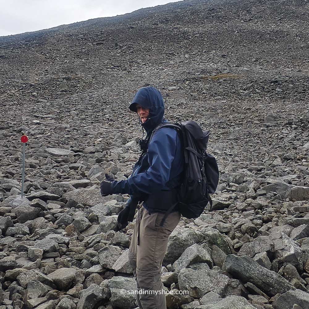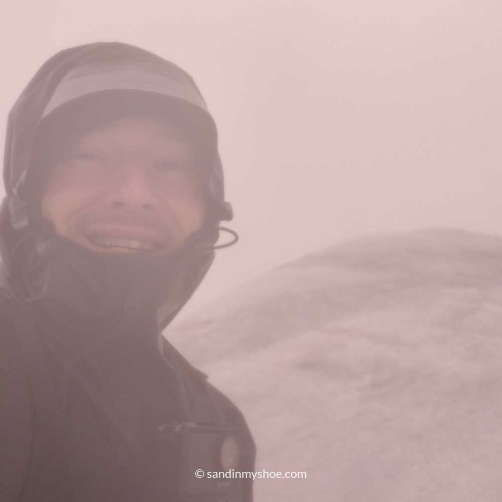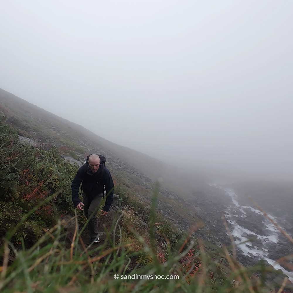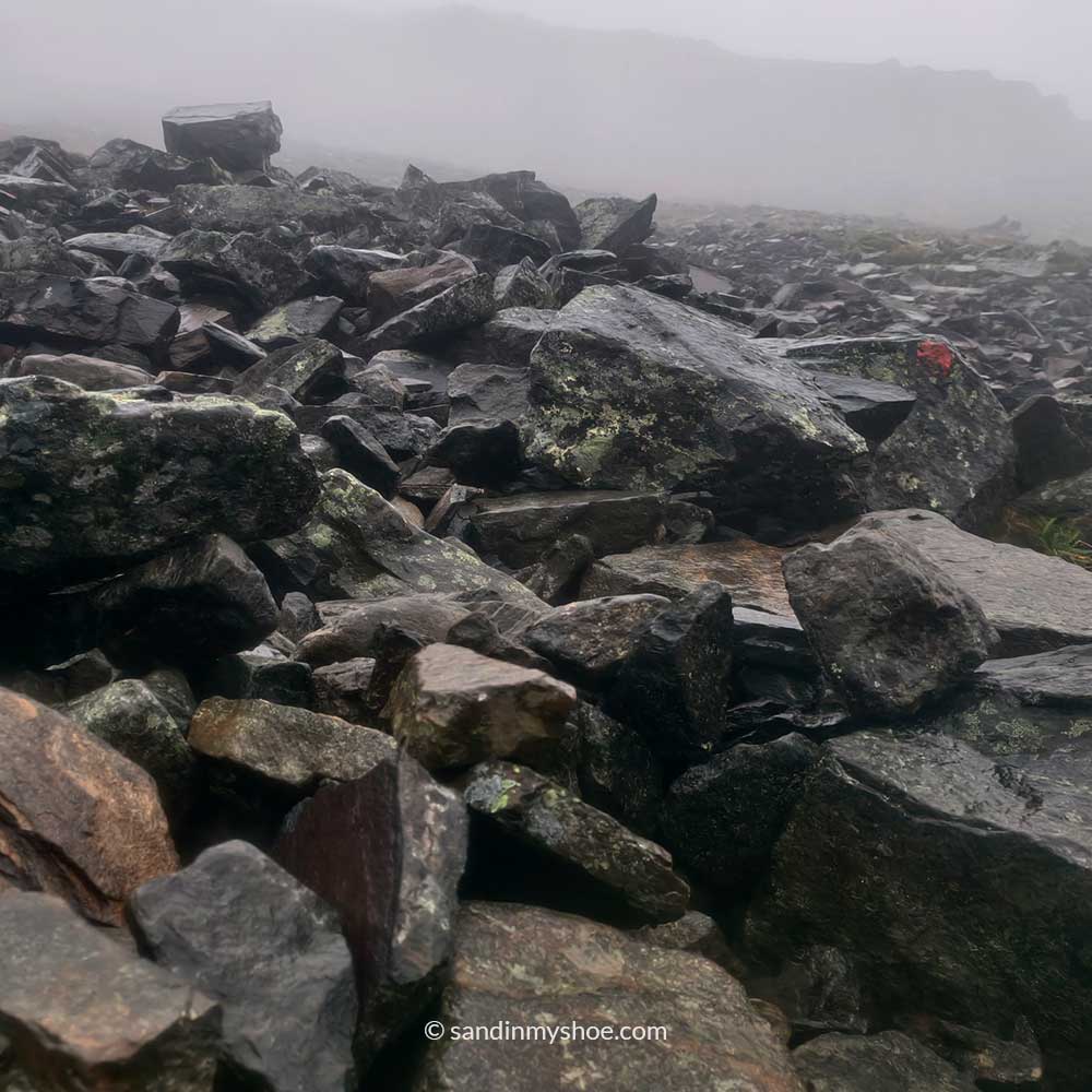 I met only seven people all day. Visibility was limited, sometimes improving briefly, but never giving a full view. The hike started with a smaller hill, then dropped into a valley covered with large stones, before climbing steadily again. I snacked on cookies and candy continuously to keep a steady flow of carbs into my legs.