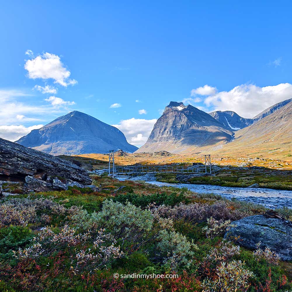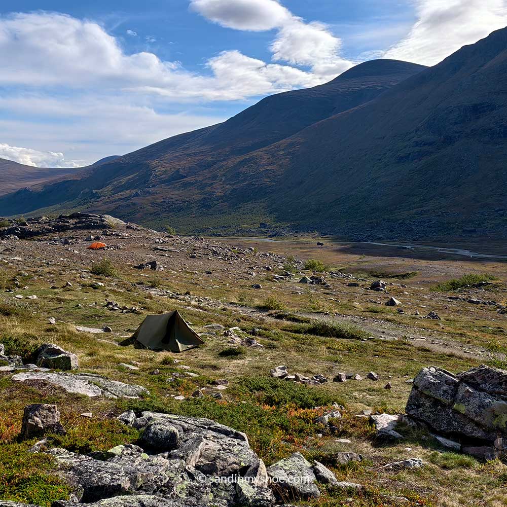 The whole day was in front of me with plenty of time to rest or wander, as nature made it hard to stay still. I had no water left, though a river glimmered in the distance. I walked to the river, which took a while, but it was worth it — the glacial water, cold and refreshing, was probably the best I’d ever tasted. The landscape looked like something from a postcard: a clear river winding through tundra, the mountains standing tall with clouds gathering behind them. Kebnekaise wasn’t visible from here — I’d have to hike between the two peaks, and only then would it appear, if the weather was clear.