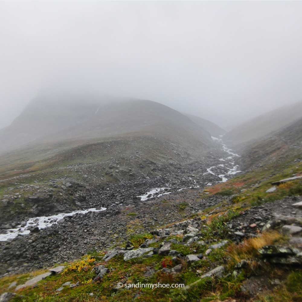 As I trekked through the mist, a herd of reindeer passed by. We exchanged casual greetings and continued on our separate ways. The trail was marked with red spray dots on rocks, though I got lost a few times. I could always find my way back with a hiking app, and I had brought a map and compass in case my phone died.