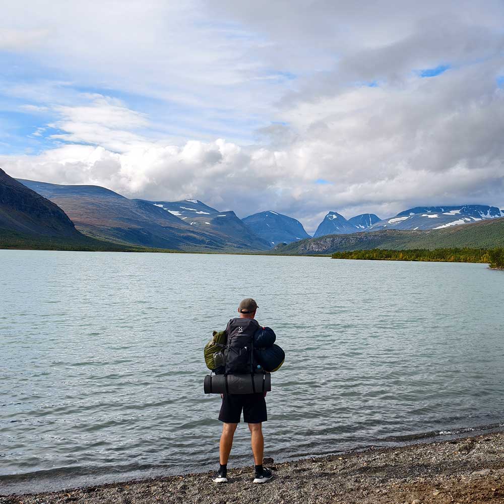 The whole day was in front of me with plenty of time to rest or wander, as nature made it hard to stay still. I had no water left, though a river glimmered in the distance. I walked to the river, which took a while, but it was worth it — the glacial water, cold and refreshing, was probably the best I’d ever tasted. The landscape looked like something from a postcard: a clear river winding through tundra, the mountains standing tall with clouds gathering behind them. Kebnekaise wasn’t visible from here — I’d have to hike between the two peaks, and only then would it appear, if the weather was clear.
