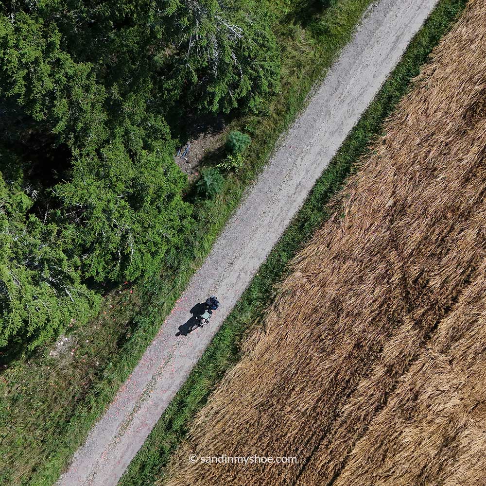 Roads varied dramatically. Much of the time, I rode smaller car roads flanked by yellowish wheat fields stretching to the horizon, dotted with occasional farmhouses. The air smelled of late summer hay and earth, and the quiet hum of tires on asphalt became a strangely comforting rhythm. Other times, I slipped into dense forests, following car roads from a forgotten past—narrow tracks of packed dirt and loose gravel, worn by time and barely touched by traffic. Roots and rocks jutted from the ground, demanding careful balance with every pedal stroke. Sunlight filtered through the canopy, lighting up moss and ferns as if the forest itself was guiding me forward.