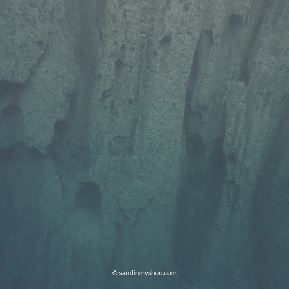 But it’s not only the thermocline that makes the Barracuda Lake special. Above the surface, tall limestone cliffs frame the lake, while jagged saw-toothed limestone spires continue beneath, creating this spooky, otherworldly underwater landscape. And then there’s the visibility. Unlike anything I’ve experienced before, with crystal clear water that let me see easily 15 meters (50 feet) down and probably around 20 meters (65 feet) across — if not more.